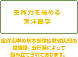 東洋医学の病理感は、人間生まれながらにして持っている生命力を高めることによって、病気を治し、すすんで予防する事にあります。ですから公害病やストレス、自律神経失調症やアレルギーなど原因不明とされている病気に対しても適切な治療を行う事ができるのです。 一方、西洋医学は病原攻撃を基本として成り立っていますから、このように攻めるべき目標のない病気に対して対症療法以外に治療方法がないのが現状です。そればかりか検査、投薬、手術と病気を攻めたてるあまり、体自体を痛めつけてしまっております。今や私たちの健康感は、自身の体質強化へと切り換えなければなりません。 |