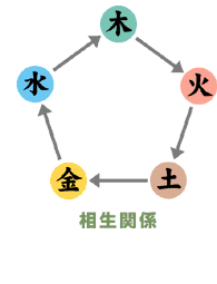 五行とは陰、陽がさらに発展し、自然界に形を表したものでこれには、木(もく)火((か)土(ど)金(きん)水(すい)があります。森羅万象すべてこの五行のいずれかに含まれるのです。五行の行は並ぶという意味で秩序を表しています。これらには、相生関係(相生まれる)、相剋関係(互いに抑制し合う)、勝復関係(再び復する)という三つの関係があります。
