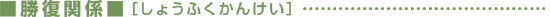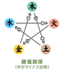 これは夫婦関係ともいい、互いに抑制し合う関係です。並んでいる五行、木火土金水、で一つ飛んだものを抑える関係です。木が根を張ることで土が崩れないように抑えます。土が土手となって水が氾濫しないように抑えます。また、土で作った器で水が分散しないように保ちます。水は燃えている火を抑え、そして燃えすぎないようにする働きです。火の熱で金属を溶かしてさまざまな物を作ります。金属は刃物となって木を削り、さまざまな物を作り出します。勝復関係 [しょうふくかんけい]